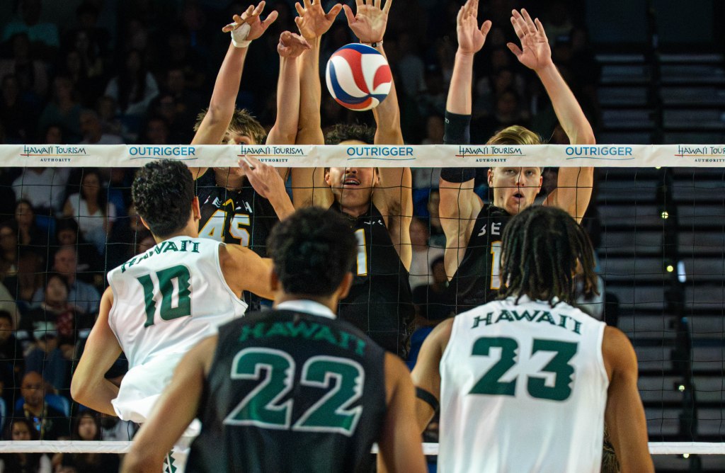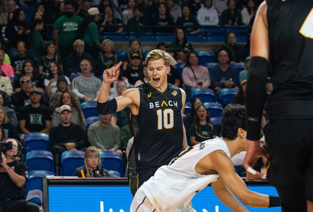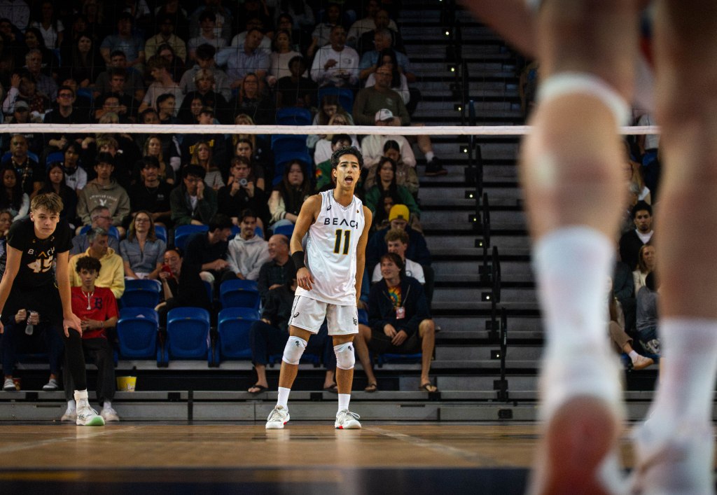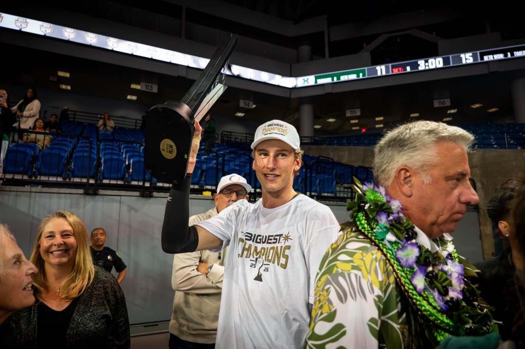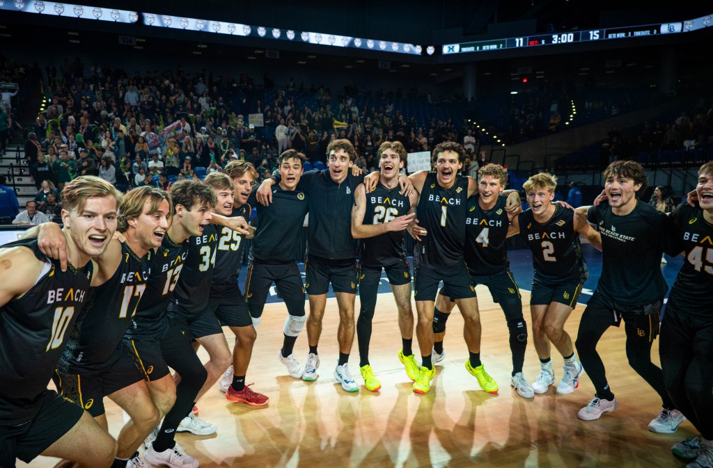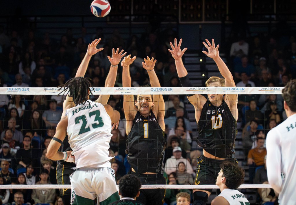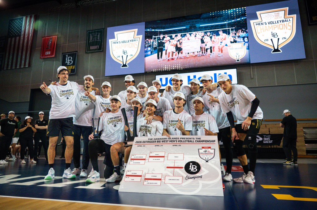 LBSU senior outside hitter/opposite Connor Bloom celebrates a winning point during the match against Hawai’i at the Big West Championship at the Bren Events Center on Saturday, April 25. Rehansa Kulatilleke | Long Beach CurrentLBSU junior opposite hitter Daniil Hershtynovich serves during the second set of the Big West Championships against Hawai’i on Saturday, April 25. The Beach defeated the Bows with a final score of 3-2 at the Bren Events Center. Rehansa Kulatilleke | Long Beach CurrentLBSU freshman middle blocker Jackson Cryst attempts to block Hawai’i outside/opposite hitter Louis Sakanoko during the third set of the Big West Championship at the Bren Events Center. Cryst ended the night with eight kills on Saturday, April 25. Rehansa Kulatilleke | Long Beach CurrentLBSU sophomore libero Kellen Larson prepares to play against Hawai’i after a timeout during the Big West Championship on Saturday, April 25. Larson concluded the night with nine digs. Rehansa Kulatilleke | Long Beach CurrentLBSU freshman opposite Wojciech Gajek, freshman middle blocker Jackson Cryst and senior outside hitter/opposite Connor Bloom block Hawai’i sophomore opposite Kristian Titriyski from scoring a point. LBSU defeated Hawai’i with a final score of 3-2 during the Big West Championships on Saturday, April 25, at the Bren Events Center. Rehansa Kulatilleke | Long Beach CurrentLBSU celebrates the Big West title after defeating Hawai’i with a final score of 3-2 on Saturday, April 25 at the Bren Events Center. Rehansa Kulatilleke | Long Beach CurrentThe LBSU men’s volleyball team poses for a photo after being named the winner of the Big West Championship at the Bren Events Center. LBSU won its title after defeating Hawai’i on Saturday, April 25. Rehansa Kulatilleke | Long Beach CurrentLBSU senior outside hitter Skyler Varga holds up the Big West Championship trophy after LBSU’s match against Hawai’i at the Bren Events Center. Varga ended the night with 16 kills on Saturday, April 25. Rehansa Kulatilleke | Long Beach Current